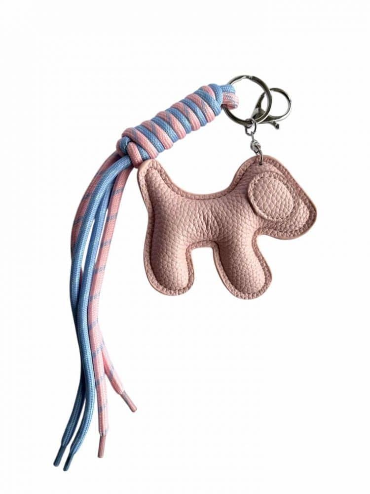 Bag charm med hund og snører, der kan bruges på en taske, i nøglebundtet eller som pynt andre steder.