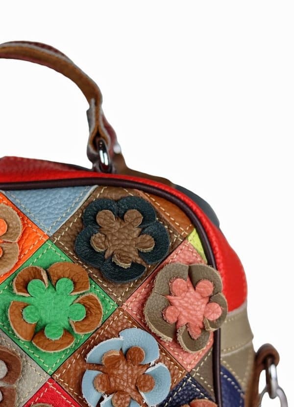 Der er ikke to af blomstertaskerne, der er ens. de har alle de samme farver af læder, men de er sammensat på forskellige måder, og dermed bliver alle tasker unikke.