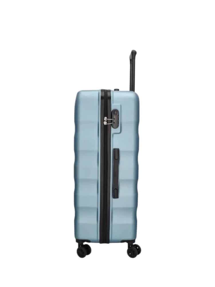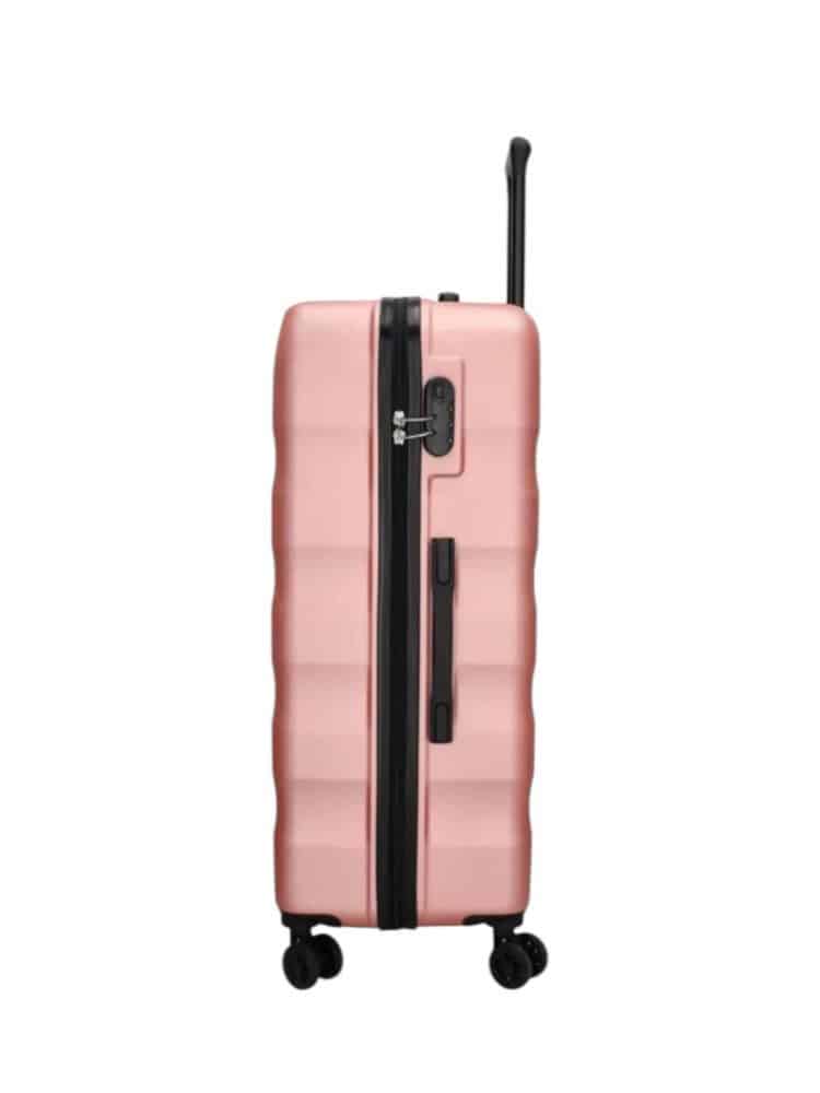 Kufferten har 360 graders hjul, som gør kufferten nem at køre. Der er justerbart håndtag, så du kan indstillet højden. Derudover er der håndtag både i toppen og på siden af kufferten, du nemt kan løfte den. Og på den ene side er der fødder, så kufferten ikke står på kassen, hvis du sætter den fra dig på siden.