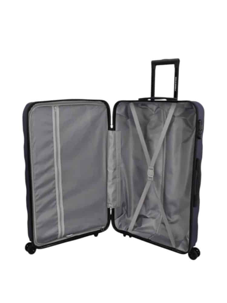 Indvendigt er kuffert inddelt i to. Kuffertens bund er et stort åbent rum, der har remme til at lukke over kuffertens indhold.